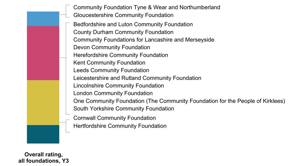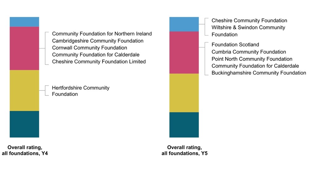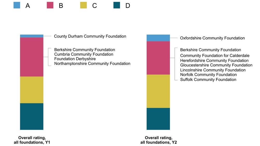 In addition, our members Wiltshire and Swindon Community Foundation and Cheshire Community Foundation both achieved an A in each domain in 2026 (alongside another non-community foundation). Only one foundation has ever achieved this before, so this is a fantastic result.